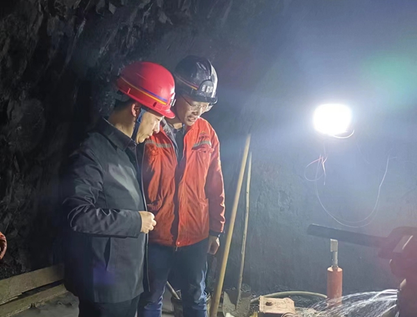 在GK1-1-2钻探现场,吴宏斌认真检查了安全生产管理措施落实及隐患排查等情况。围绕钻窝顶部及敲帮问顶、现场定置管理、机械通风及防尘与降温、设备材料转运、人员上下班及井巷内安全通行等内容与工作人员进行了交流,并就相关具体问题进行现场指导。在项目驻地,还深入一线职工宿舍、食堂了解情况。